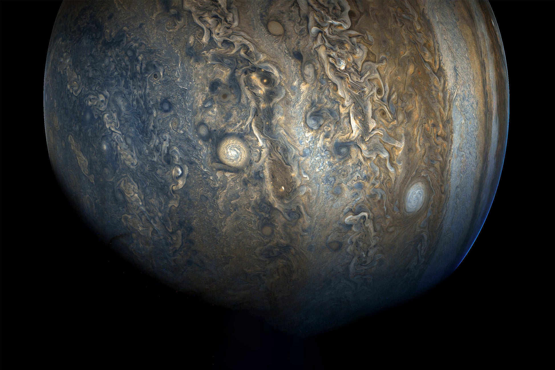 See Jupiter's southern hemisphere in beautiful detail in this new image taken by NASA's Juno spacecraft. The view captures one of the white ovals in the "String of Pearls," one of eight massive rotating storms at 40 degrees south latitude on the gas giant planet.