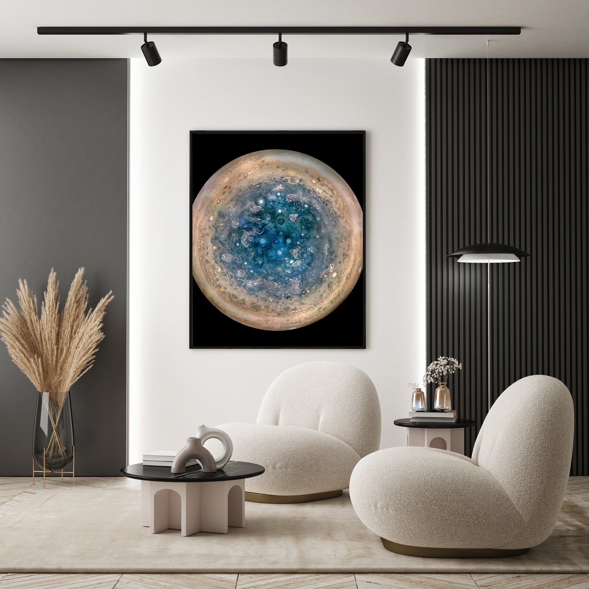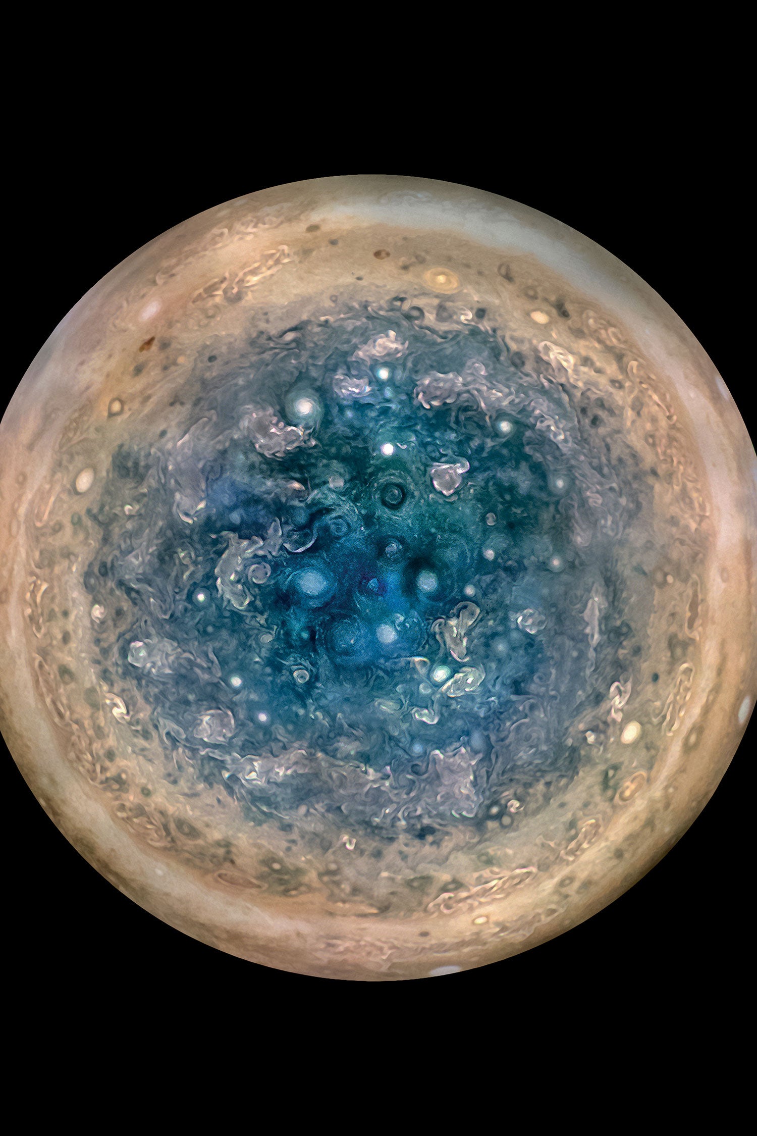 This image shows Jupiter's south pole, as seen by NASA's Juno spacecraft from an altitude of 52,000 kilometers. The oval features are cyclones, up to 1,000 kilometers in diameter. Multiple images taken with the JunoCam instrument on three separate orbits were combined to show all areas in daylight, enhanced color, and stereographic projection.